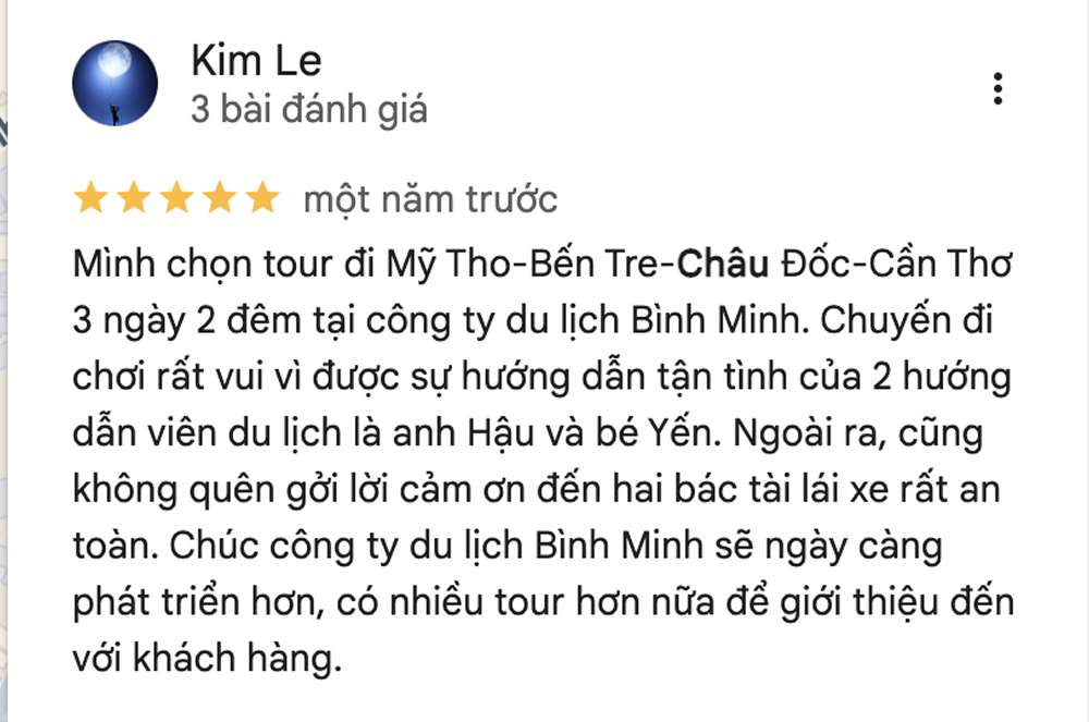 Mình chọn tour đi Mỹ Tho-Bến Tre-Châu Đốc-Cần Thơ 3 ngày 2 đêm tại công ty du lịch Bình Minh. Chuyến đi chơi rất vui vì được sự hướng dẫn tận tình của 2 hướng dẫn viên du lịch là anh Hậu và bé Yến. Ngoài ra, cũng không quên gởi lời cảm ơn đến hai bác tài lái xe rất an toàn. Chúc công ty du lịch Bình Minh sẽ ngày càng phát triển hơn, có nhiều tour hơn nữa để giới thiệu đến với khách hàng