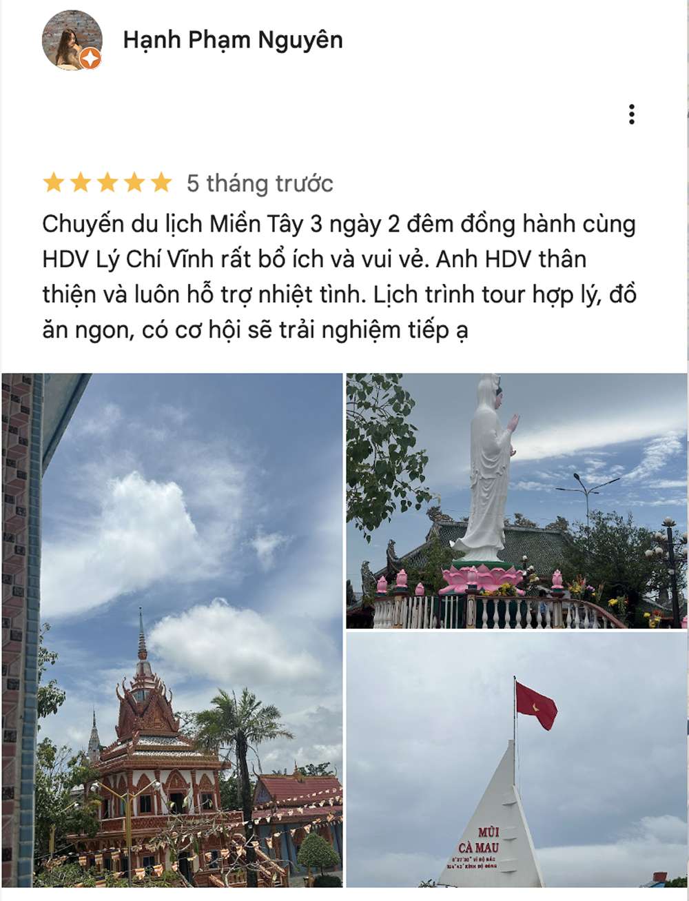 Chuyến du lịch Miền Tây 3 ngày 2 đêm đồng hành cùng HDV Lý Chí Vĩnh rất bổ ích và vui vẻ. Anh HDV thân thiện và luôn hỗ trợ nhiệt tình. Lịch trình tour hợp lý, đồ ăn ngon, có cơ hội sẽ trải nghiệm tiếp ạ