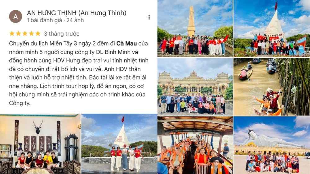 “Chuyến du lịch Miền Tây 3 ngày 2 đêm đi Cà Mau của nhóm mình 5 người cùng công ty DL Bình Minh và đồng hành cùng HDV Hưng đẹp trai vui tính nhiệt tình đã có chuyến đi rất bổ ích và vui vẻ. Anh HDV thân thiện và luôn hỗ trợ nhiệt tình. Bác tài lái xe rất êm ái nhẹ nhàng. Lịch trình tour hợp lý, đồ ăn ngon, có cơ hội chúng mình sẽ trải nghiệm các chương trình khác của Công ty.”