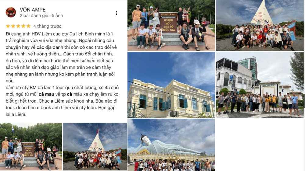 cảm ơn cty BM đã làm 1 tour quá chất lượng, xe 45 chỗ mới, ngủ từ mũi cà mau về tp cà màu xe chạy êm ru ko biết gì hết trơn. Chúc a Liêm sức khoẻ nha. Bữa nào đi tour, đoàn bên em book anh Liêm với cty luôn. Hẹn gặp lại a Liêm.”
