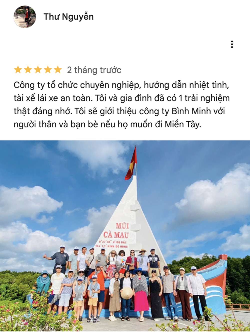 Công ty tổ chức chuyên nghiệp, hướng dẫn nhiệt tình, tài xế lái xe an toàn. Tôi và gia đình đã có 1 trải nghiệm thật đáng nhớ. Tôi sẽ giới thiệu công ty Bình Minh với người thân và bạn bè nếu họ muốn đi Miền Tây.