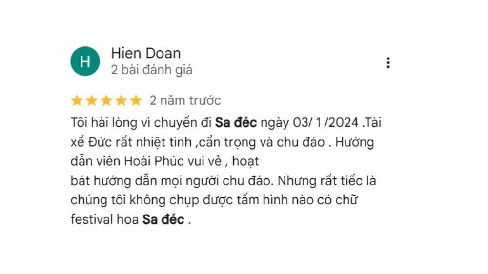 “Tôi hài lòng vì chuyến đi Sa đéc ngày 03/ 1 /2024. Tài xế Đức rất nhiệt tình ,cẩn trọng và chu đáo . Hướng dẫn viên Hoài Phúc vui vẻ, hoạt bát hướng dẫn mọi người chu đáo. Nhưng rất tiếc là chúng tôi không chụp được tấm hình nào có chữ festival hoa Sa đéc .”