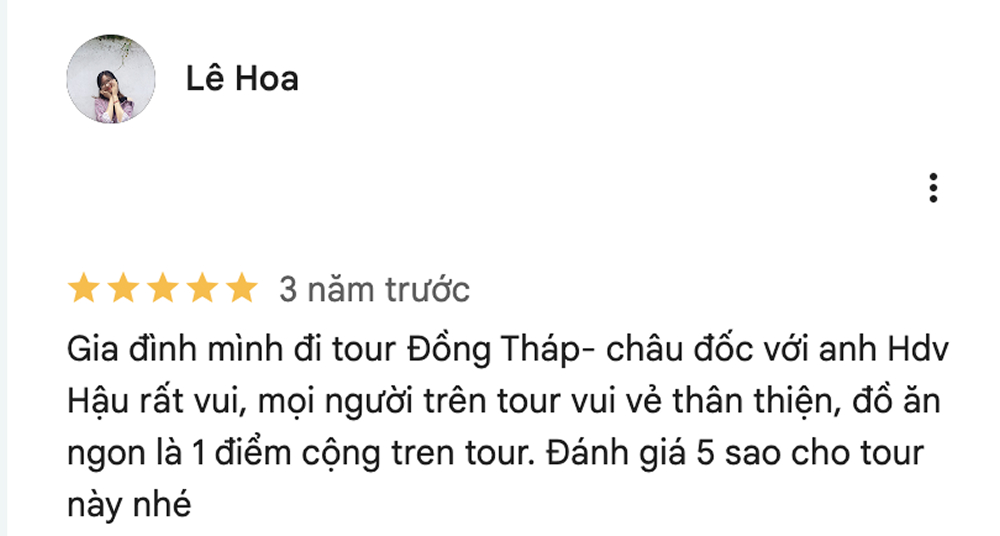 Gia đình mình đi tour Đồng Tháp- châu đốc với anh Hdv Hậu rất vui, mọi người trên tour vui vẻ thân thiện, đồ ăn ngon là 1 điểm cộng tren tour. Đánh giá 5 sao cho tour này nhé