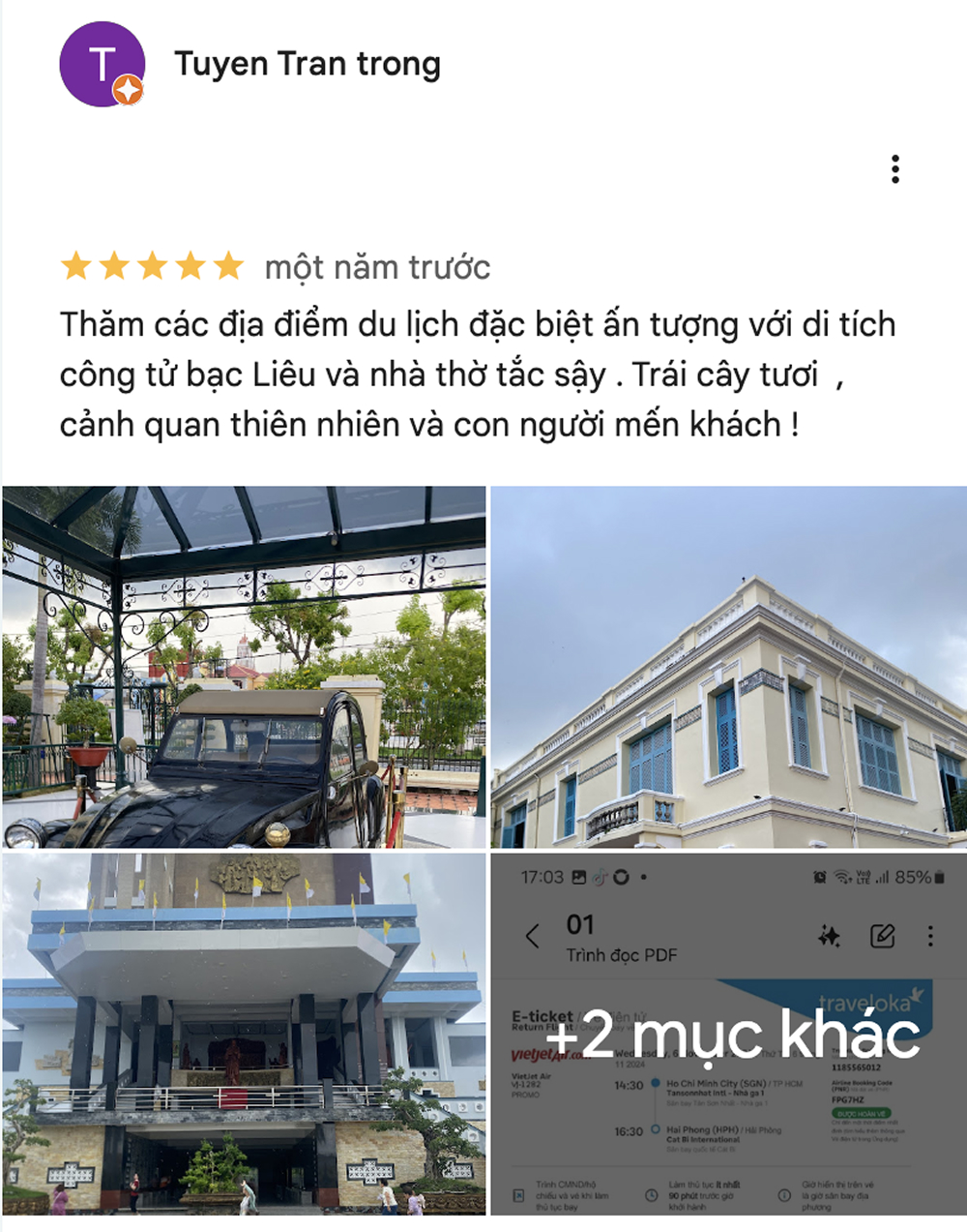 Thăm các địa điểm du lịch đặc biệt ấn tượng với di tích công tử bạc Liêu và nhà thờ tắc sậy . Trái cây tươi , cảnh quan thiên nhiên và con người mến khách !