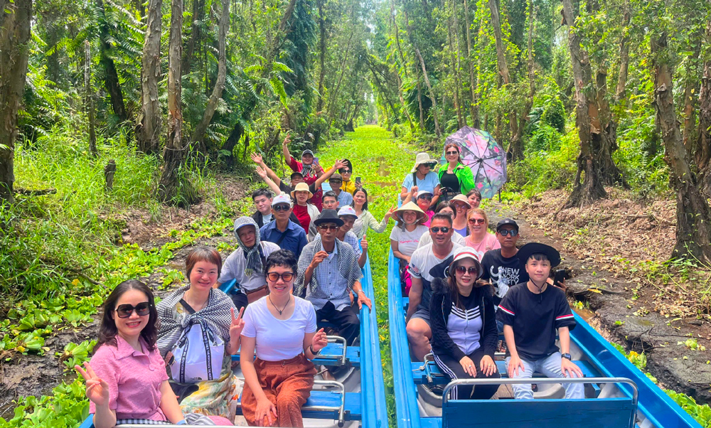 Ngồi xuồng nhẹ trôi trên mặt nước phủ đầy bèo xanh, bạn sẽ được đưa sâu vào bên trong cánh rừng tràm – nơi ánh sáng len qua tán cây, chim hót vang và không khí mát rượi. Đây là phần được nhiều du khách đánh giá “đáng giá nhất” của chuyến đi.