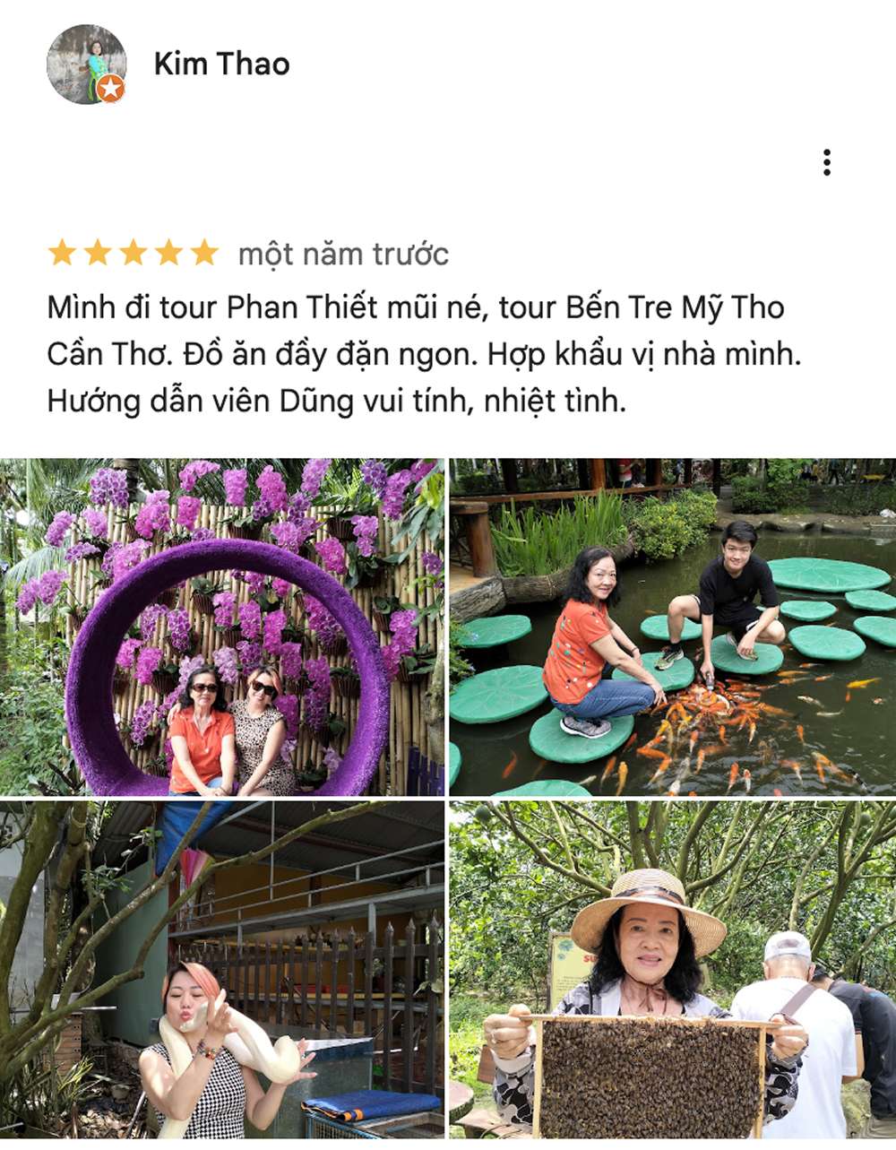 Mình đi tour Phan Thiết mũi né, tour Bến Tre Mỹ Tho Cần Thơ. Đồ ăn đầy đặn ngon. Hợp khẩu vị nhà mình. Hướng dẫn viên Dũng vui tính, nhiệt tình.
