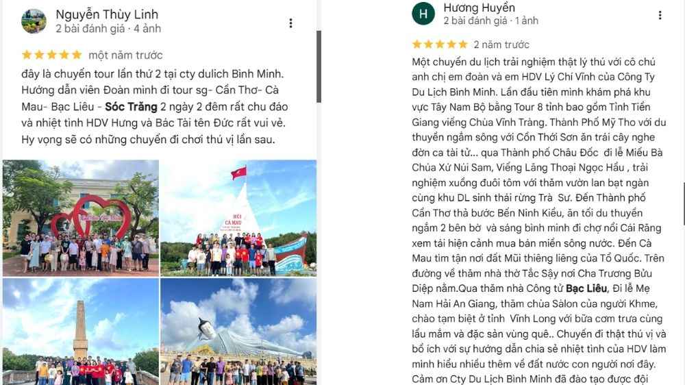 “Đây là chuyến tour lần thứ hai tôi đồng hành cùng Du Lịch Bình Minh. Đoàn tham gia tour Sài Gòn - Cần Thơ - Cà Mau - Bạc Liêu - Sóc Trăng 2 ngày 2 đêm với lịch trình hợp lý. Hướng dẫn viên Hưng nhiệt tình, chu đáo, bác tài Đức vui vẻ và thân thiện, tạo cảm giác thoải mái suốt chuyến đi. Hy vọng sẽ tiếp tục có thêm nhiều chuyến trải nghiệm thú vị cùng công ty trong thời gian tới.”