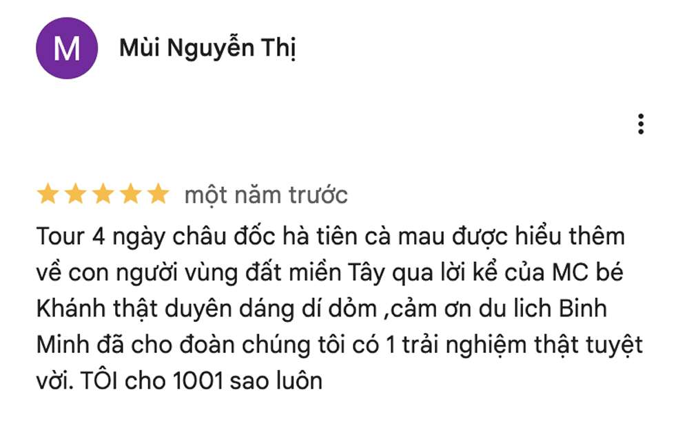 Tour 4 ngày châu đốc hà tiên cà mau được hiểu thêm về con người vùng đất miền Tây qua lời kể của MC bé Khánh thật duyên dáng dí dỏm ,cảm ơn du lich Binh Minh đã cho đoàn chúng tôi có 1 trải nghiệm thật tuyệt vời. TÔI cho 1001 sao luôn