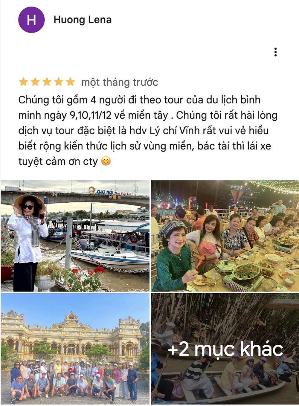 Tìm tour miền tây trên mạng thấy bên mình được đánh giá cao với giá cả hợp lý nên đăng ký trải nghiệm tour. Vô tình được dẫn đoàn bởi bạn Lý Chí Vĩnh rất nhiệt tình, chu đáo chăm sóc đoàn, giới thiệu tỉ mỉ các địa danh khi đặt chân tới và bác Thụ tài xế vui tính, lái xe êm ru.
