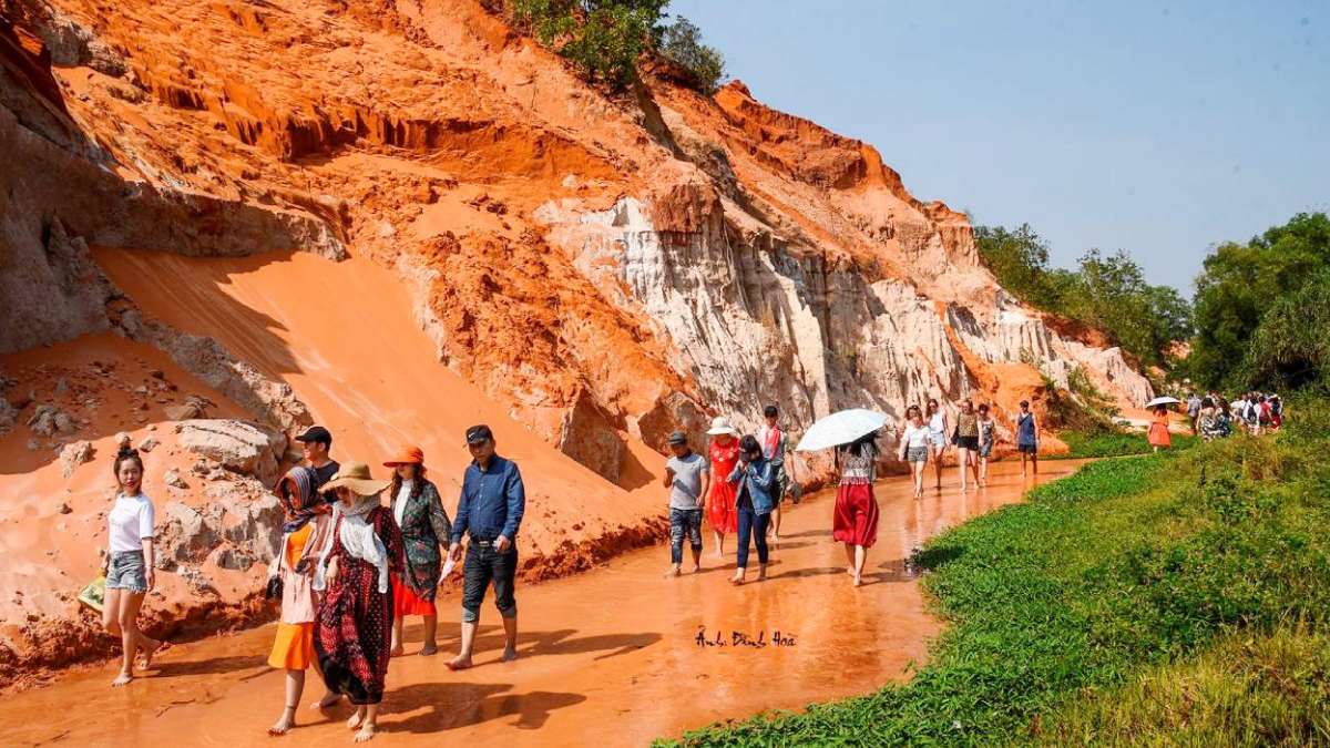 Không giống với bất kỳ dòng suối nào, Suối Tiên Mũi Né gây ấn tượng với dòng nước nông màu đỏ cam đặc trưng do phù sa, bao quanh là vách đá sét nhiều hình thù cùng thảm thực vật xanh mát.