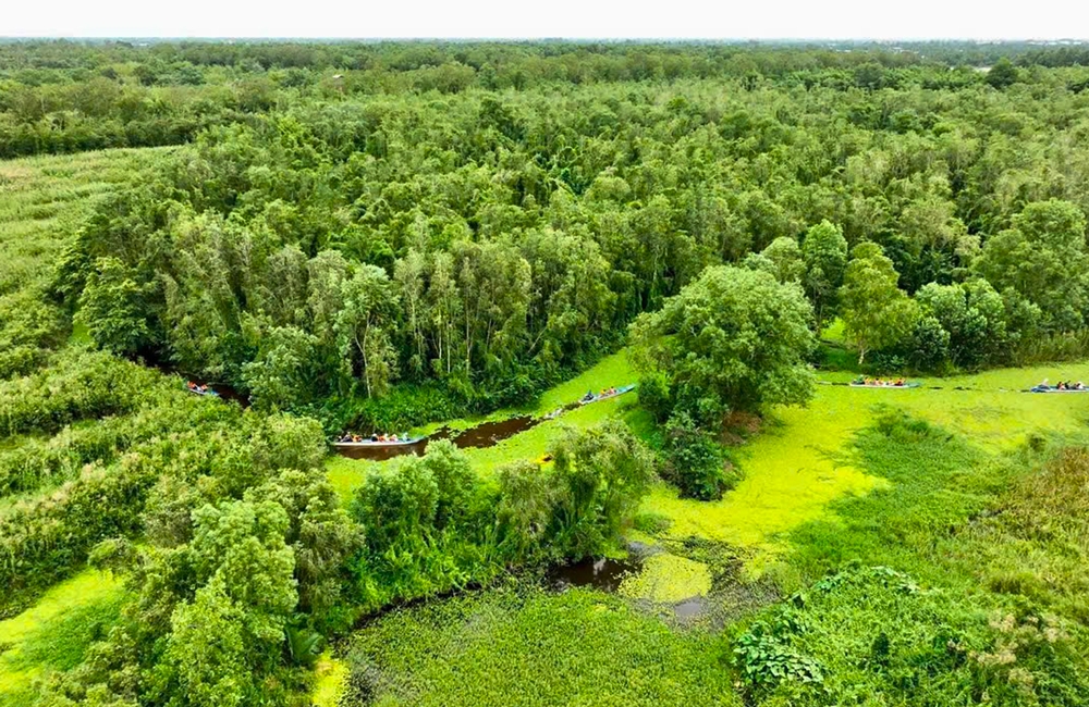 9h00: Quý khách xuống đò và tiếp tục hành trình len lỏi vào những hệ thống kênh rạch chằng chịt và cũng như du khách sẽ được đắm mình trong không khí trong lành vào buổi sáng, ngắm từng đàn chim bay ra từ khu rừng để đi tìm thức ăn, tiếng kêu xao động cả một khu rừng. Đi xuồng len lỏi trong khu này, mọi người thích thú ngắm hơn 20 loài chim sinh sống với hàng chục ngàn con cò, cồng cộc, vạc, giang sen… Còn dưới nước cá ục tìm thức ăn, làm dòng kênh lăn tăn gợn sóng.
