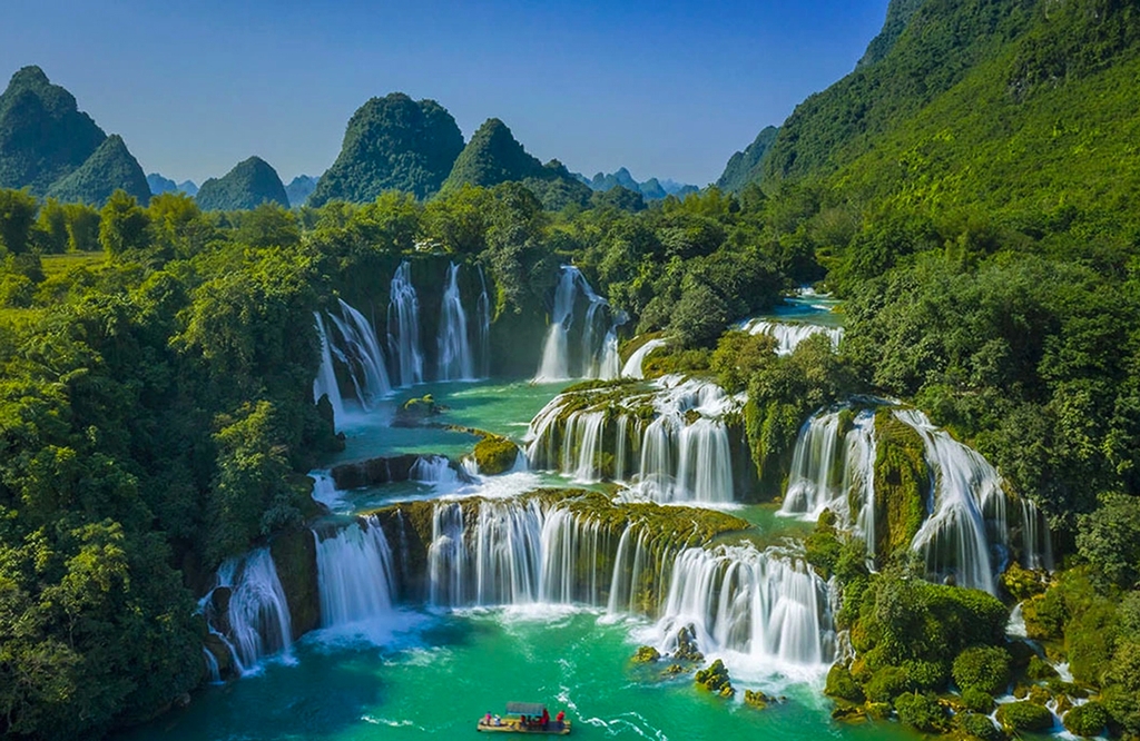 Thác Bản Giốc – một trong những thác nước đẹp và hùng vĩ nhất Việt Nam, nằm trên biên giới Việt Nam – Trung Quốc. Du khách có thể trải nghiệm đi bè tre trên sông Quây Sơn để chiêm ngưỡng thác nước từ khoảng cách gần hơn (chi phí tự túc).
