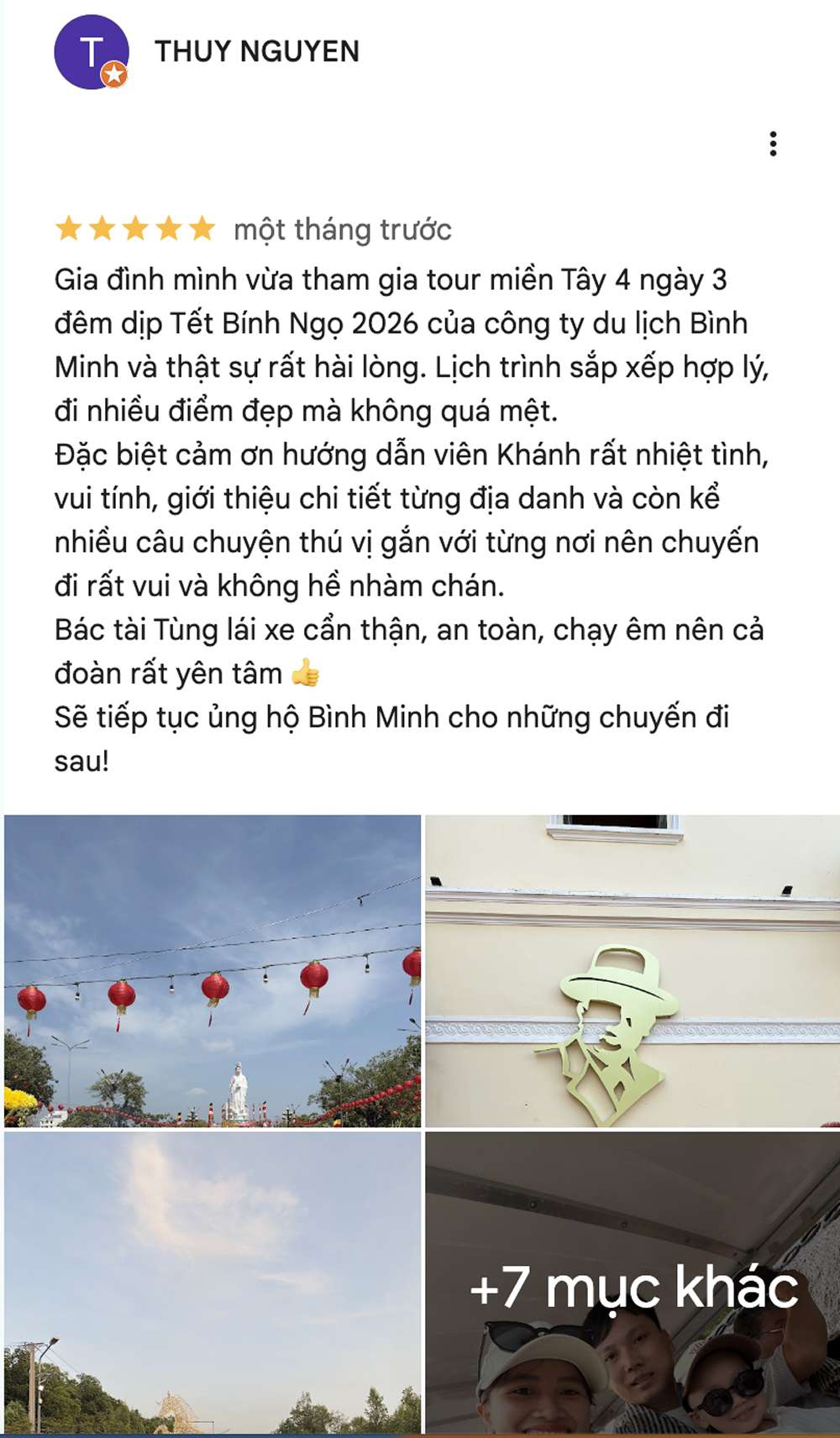 Gia đình mình vừa tham gia tour miền Tây 4 ngày 3 đêm dịp Tết Bính Ngọ 2026 của công ty du lịch Bình Minh và thật sự rất hài lòng. Lịch trình sắp xếp hợp lý, đi nhiều điểm đẹp mà không quá mệt.